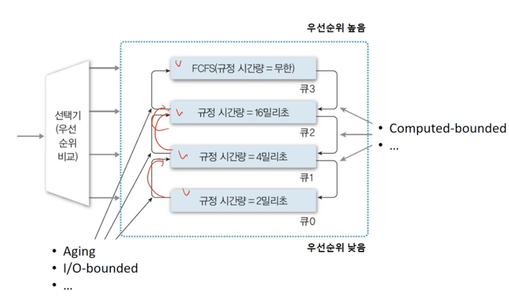 - 각 준비 큐마다 시간 할당량을 다르게 배정