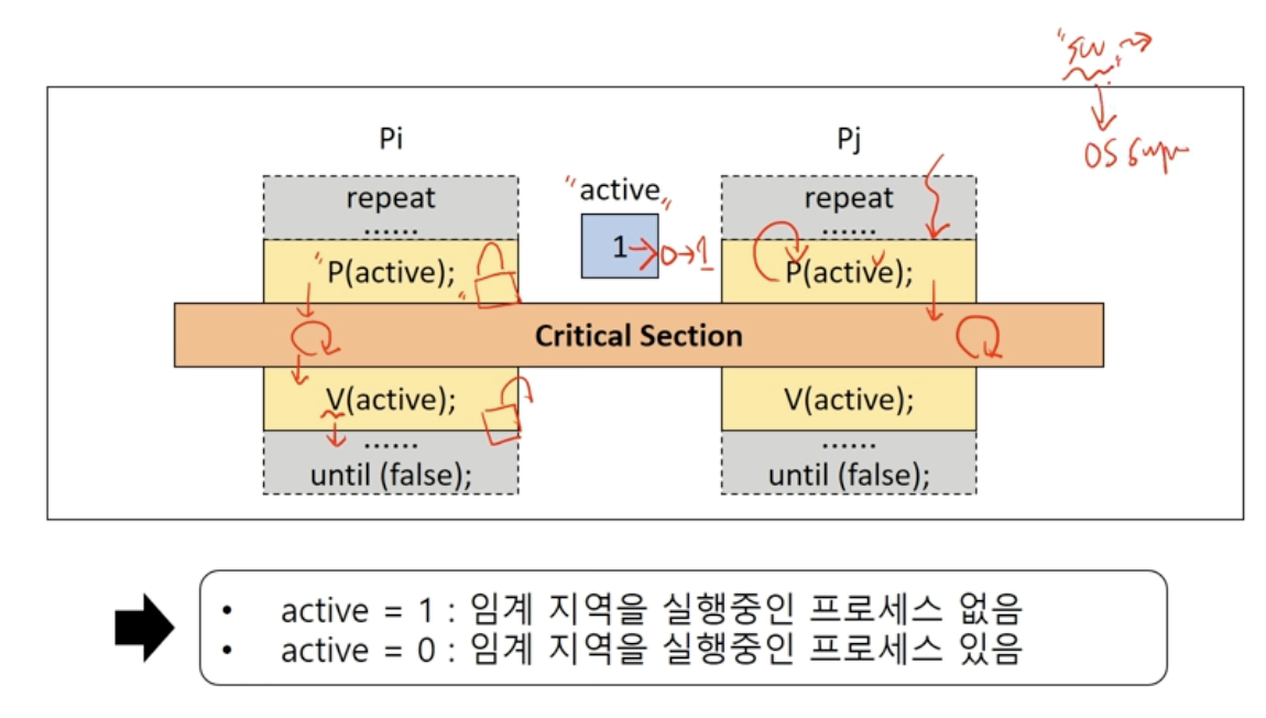 - Critical section (CS)에 프로세스가 있으면, 다른 프로세스의 진입을 금지