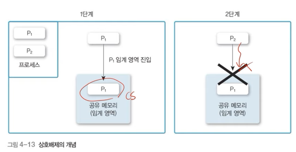 - 둘 이상의 프로세스가 동시에 critical section에 진입하는 것을 막는 것