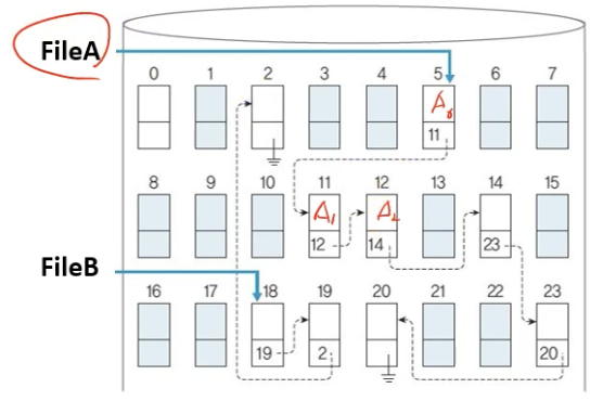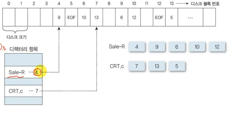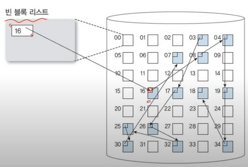 - 각 block의 시작 부분에 다음 블록의 번호를 기록하는 방법