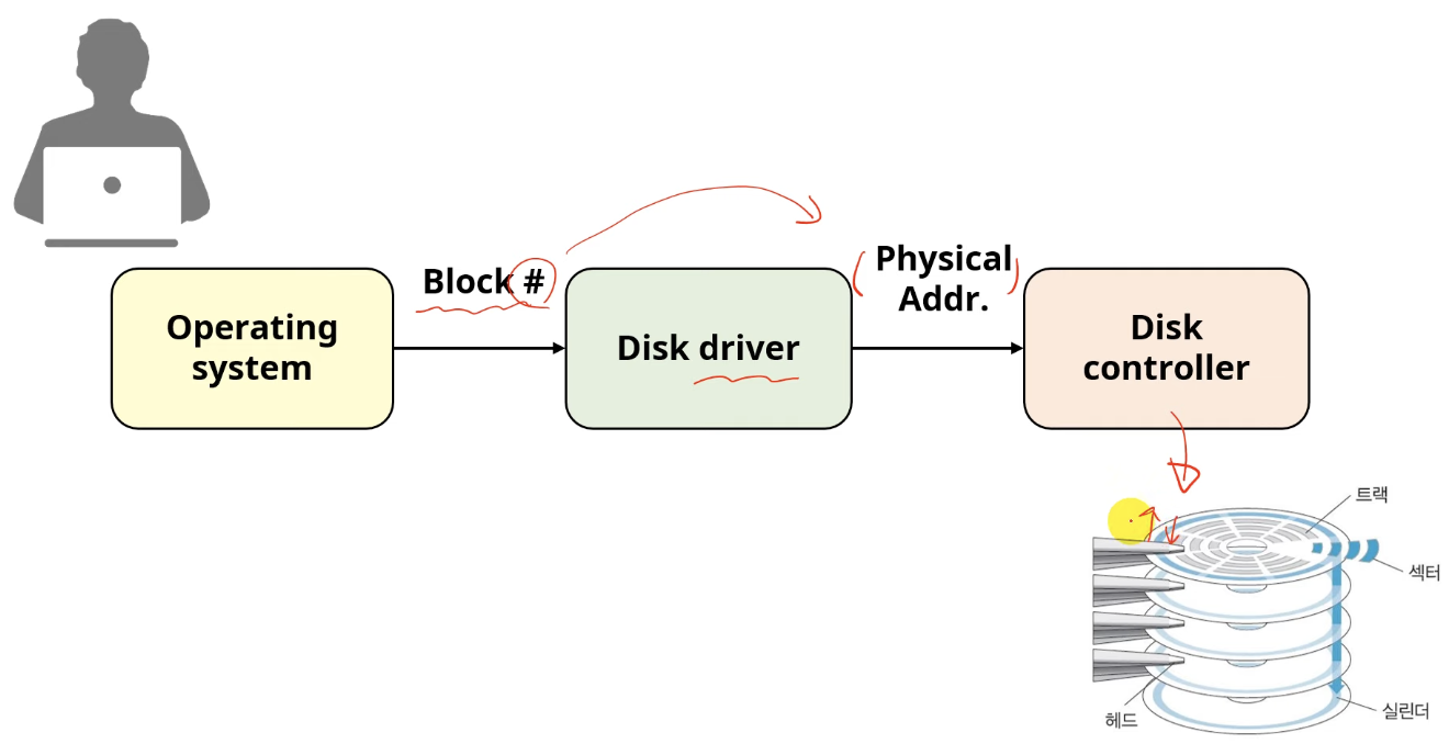- Block 번호 → physical address 모듈 필요 (disk driver)